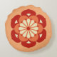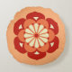 Japanese mandala design round pillow that depicts a stylised lotus flower, symbolising purity, spiritual awakening and faithfulness - flower in deep mandarin orange, medium orange and cream on a soft pastel orange background