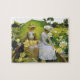 A fine art jigsaw puzzle featuring the painting - Lotus Lilies (1888) by Charles Courtney Curran, an American Impressionist known for his landscapes and figurative works, particularly of women. It depicts two women under a parasol, seated in a boat amidst a bloom of yellow lilies in a pond.