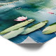Amazing watercolor of a lotus pond with blooming pink lotuses, beautiful turquoise and green water reflexions with trees in the background.
