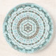 This concentric circle mandala features layers of white, turquoise and brown patterns inspired by Celtic weaves and Indian henna, such as vines, ribbons, and lotus flowers.