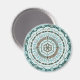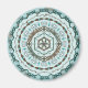 This concentric circle mandala features layers of white, turquoise and brown patterns inspired by Celtic weaves and Indian henna, such as vines, ribbons, and lotus flowers.
