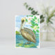 A postcard decorated with an Eastern Brown Pelican bird perched on a rock in a lake with trees in the distance under a soft blue cloudy sky illustrated with ink and watercolor. Inspired by the state bird and state flower of Louisiana. You can edit or remove the text to fit your needs.
