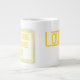 A white jumbo mug with The Fan Lounge We're Always Open logo on one side and Lounger on the other in Neon Yellow. (Handle on right side.)