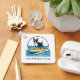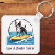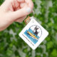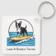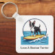 Keychain gift for anyone who loves their Boston Terrier family pet in a fun design with graphic of a Boston Terrier riding a surfboard on a wave in a beachy design that is fun and colorful.