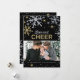 Festive holiday photo card design features sparkling silver and gold snowflakes and "Love and Cheer" wording with custom text and a picture that can be personalised. Snowflake border and script have a textured glitter looking appearance on a black background.