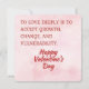 Celebrate the journey of a true, evolving relationship with this elegant Valentine's Day card. Featuring the profound quote, "To love deeply is to accept growth, change, and vulnerability," this card honors the strength and openness required for a lasting bond. The design is set against a dreamy, soft pink watercolor background with subtle heart patterns, and the message is written in a sophisticated dark red serif font, topped with a bold "Happy Valentine's Day" script. It’s a perfect choice for a partner who has grown alongside you through all of life's seasons.