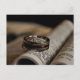 A man's wedding band, an engagement ring, and a woman's wedding band sitting on a Bible