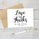 "Love and Thanks" is displayed in dramatic, oversized hand-lettered calligraphy on this bold and beautiful wedding thank you card. The couple's monogram "Mr. and Mrs." name and wedding date are featured beneath in clean script lettering, completing a striking typographic composition. Personalize the name, date, and inside message for a keepsake your guests will keep long after the celebration.