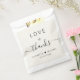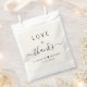 Chic light cream favour bags for your wedding guests featuring "Love + Thanks" in simple modern typography and an elegant script with swashes, your first names joined together by a heart and your wedding date.