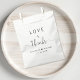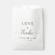 Elegant white favour bags for your wedding guests featuring "Love + Thanks" in simple modern typography and a stylish script with swashes, your first names joined together by a heart and your wedding date.