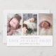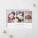 Simple and modern birth announcement cards feature three of your favourite newborn photos aligned side by side, with a white band along the bottom reading "love at first sight" in lavender lilac, flanked by your little one's name and birth stats. Chic baby girl birth announcements reverse to a subtle botanical vines pattern in matching pastel purple and off white.