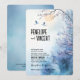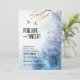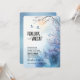 The design features a watercolor image of a romantic scenery with 2 love birds and cherry flowers on a watercolor blue and beige background. This all-in-one invitation includes a QR code on the back, which you can personalise to direct your guests to your wedding website for more details and RSVP.