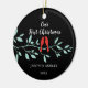 Our First Christmas Ornament features a stylish pair of red love birds sitting on a blue branch & set on a black background! Personalise with your information and date and you're all set to go! Wonderful dated keepsake gift for your first christmas and a great addition to you christmas ornament collection.