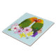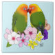 Two love birds together on a tree branch with pink, white, yellow and purple flowers in a backdrop of blue