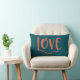 This colourful and modern pillow says "Love" in whimsical, orange typography on a bold dark teal coloured background.