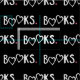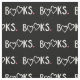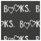 A patterned fabric for the avid reader, with BOOKS written in white on black, with hearts for o's and cute pink hearts as periods.
