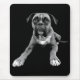 This fun canine mousepad features a black and white image of a Boxer pup highlighted against a creamy black background.