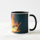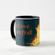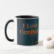 Mug design for sitting around the campfire, or bonfire, with custom saying. Dark colour with burning fire image and bright orange text. Sample says, "I love camping", and is easy to change. Comes in many mug styles or choose the travel cup.