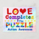 Inspirational Autism quote, Love Completes The Puzzle, with colourful Autism puzzle pieces and a beautiful butterfly to support Autistic children and their families.