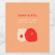 This customisable floral label showcases two joined circular organic shapes in red and cream, symbolising love, couple and marriage. The background is salmon and the following words are inscribed: couple names and date and place of the wedding.