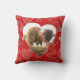 Red and white LOVE typography accent pillow with a cute doodle hearts pattern and a heart shape custom couple's photo with names' initials.