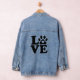 A love text design in black for dog lovers! This design features a dog paw print with a cut out heart in the middle. Shown here on a women's denim jacket. Customise it with your own message and resize the design if you like. It's a fun way to show how much you love your dogs! I know I love all three of mine!