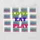 Green, Purple, and Red: These vibrant colours are used for the words "Love," "Eat," and "Play," respectively, providing strong visual contrast against the lighter background and adding a playful touch.