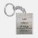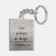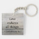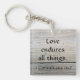 Quote from First Corinthians graces both sides of this key chain with wooden photo background. "Love endures all things." Natural grain and variation in the wood visible from years of wind, sun, and rain. A perfect metaphor for the endurance of love, expressed in the quote from scripture. Nice gift for wedding party and guests, with a gender neutral colouring and design. Order as is, or customise one or both sides to personalise with your own wording.