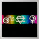 A textured rainbow background with the male and female signs, which include the ying-yang in the centre of the signs. In the centre of this design is a heart with the equal sign. In a white font is the text, Love Equality.