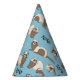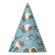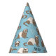 Hand-drawn ferrets, xoxo and hearts pattern paper party hats, blue background.
