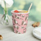 Hand-drawn ferrets, xoxo and hearts pattern paper cups, pink background.