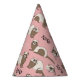 Hand-drawn ferrets, xoxo and hearts pattern paper party hats, pink background.