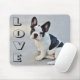 This fun mouse pad features a portrait of a black and white French Bulldog puppy sitting on a grey pavement with love printed in a bold black font.