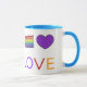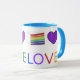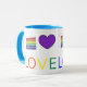 Ceramic mug features an original marker illustration of a rainbow layer cake and a purple heart, with LOVE in a pretty rainbow font.