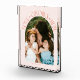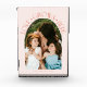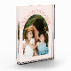 Modern and minimal family memory photo block featuring a photo in a arch frame with a text that says "Love Grows Here" with tiny hearts. Peach.