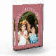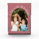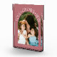 Modern and minimal family memory photo block featuring a photo in a arch frame with a text that says "Love Grows Here" with tiny hearts. Pink.