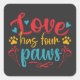 Cute and colourful dog design stickers with text of red, yellow, and blue with paw prints reads Love Has Four Paws! The dog lover will love these cute Love Has Four Paws dog stickers!