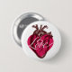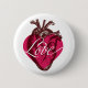 Love Heart Button. Vintage woodcut heart background. Red heart with white LOVE on top. Nice accessory to dress up your jacket. Makes for a fun party favour, Valentine gift. Heart on your sleeve, or jean jacket. Love and kisses.
