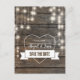 Love heart String of lights Save The Date, this design have a rustic wooden background with string of lights and a white heart and Save the Date banner
