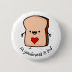 Cute slice of bread toast with a happy smiling face and a red love heart on his belly. Below is a bread pun all you knead is loaf in black text.