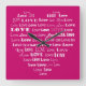 Love Heart Word Cloud - White on Fuchsia Pink Square Wall Clock