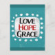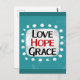 "Love Hope Grace" is a cute inspirational or motivational quote with a white accent shape surrounded by white textured whimsical dots.