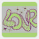 Handwritten bold letters, hearts and stars. On some products you can play with background colour.