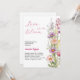 A chic white background. Decorated with a wildflowers in pink, purple, yellow. Personalise and add the name of the bride to be and party details. Text: Love is in bloom.