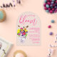 Love is in bloom! Vibrant floral wedding collection featuring a bouquet in a marble vase surrounded by butterflies, and accompanied by fuchsia script typography.