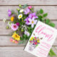 Love is in bloom! Vibrant floral wedding collection featuring a bouquet in a marble vase surrounded by butterflies, and accompanied by fuchsia script typography.