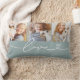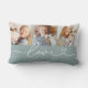 Modern and stylish custom lumbar throw pillow design features a photo collage of three (3) favourite photos with a simple and minimal white "Love" typography design that includes flourish and heart details. The neutral grey mist green and white colours can be modified.