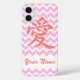 This stylish phone case features the Chinese and Japanese character for "Love," written in dark pink. The symbol appears on a pastel pink and white chevron-style zigzag background, with a space to add your own name or short message to the case in a pink script font. Open the full editor to change the chevron colour!