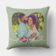 Modern and stylish custom throw pillow design features a favourite photo in a big heart shape with a minimal white "Love" typography overlay design that includes flourish and heart details. The leafy laurel green background colour can be modified. A unique gift idea for a newlywed couple or for your loved one on Valentine's Day!