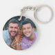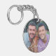 Modern and stylish custom keychain design features a favourite photo with a minimal white "Love" typography overlay design that includes flourish and heart details. The white coloured text can be customised.